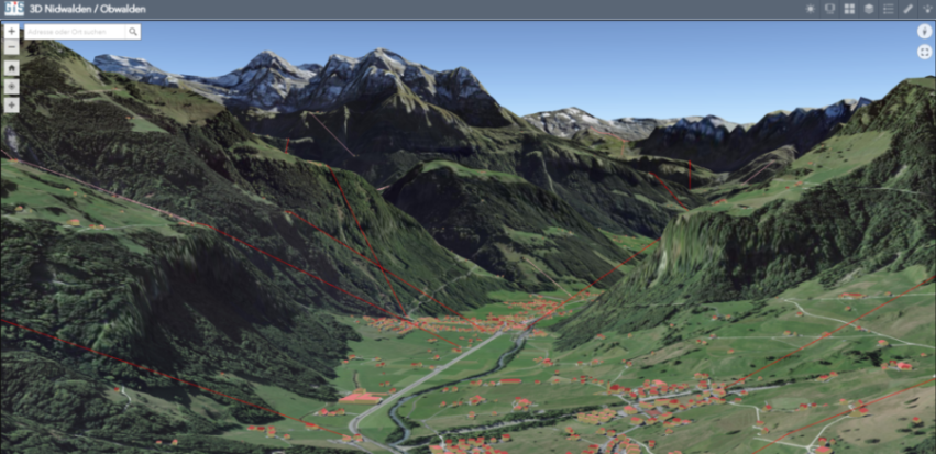 Ferner sind weitere 3D-Objekte wie Seilbahnen integriert. Neben dem Luftbild stehen die Grundkarten Basisplan der amtlichen Vermessung und Grundnutzung der Nutzungsplanung zur Verfügung.