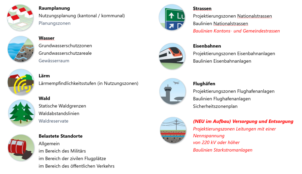 Der Kataster ist ein praktisches interaktives Informationssystem, das eine Übersicht über die relevantesten ÖREB umfasst. Es bietet Informationen zu folgenden Kategorien, die in verschiedene Themen unterteilt sind: