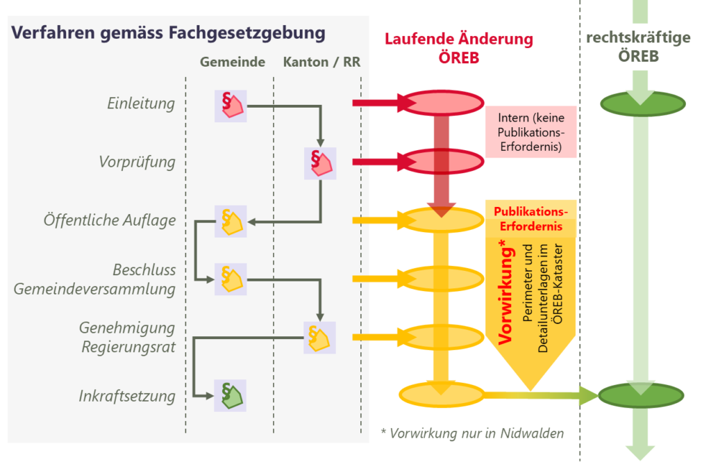 Basierend auf Art. 8b Abs. 1 lit. c der Verordnung über den Kataster der öffentlich-rechtlichen Eigentumsbeschränkungen (ÖREBKV, SR 510.622.4) werden im ÖREB Kataster nicht nur die rechtskräftigen Eigentumsbeschränkungen, sondern zusätzlich Informationen zu laufenden Änderungen und Vorwirkungen präsentiert.