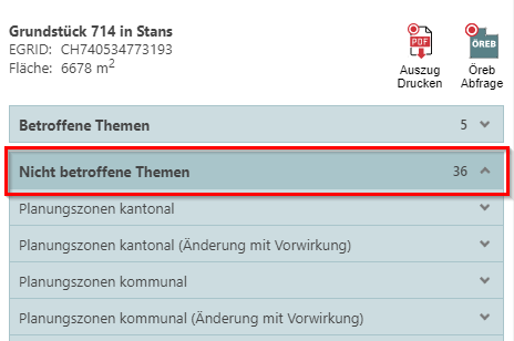 In der Liste der Nicht betroffene Themen werden alle ÖREB-Themen aufgeführt, zu denen Daten verfügbar sind, die aber das gewählte Grundstück nicht betreffen (siehe Abb. 6).