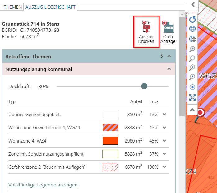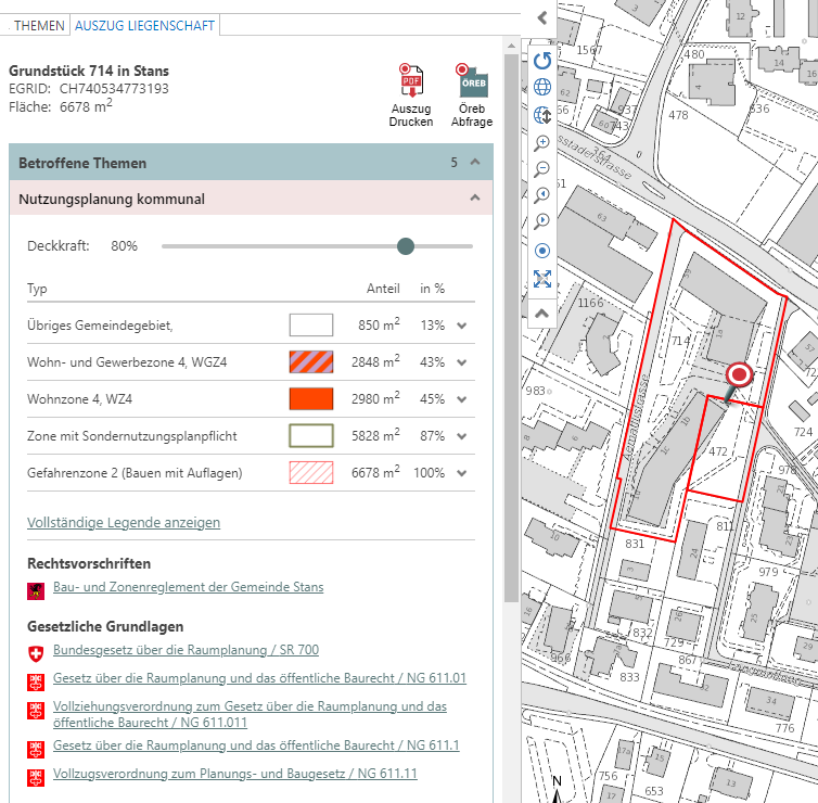 Zuoberst werden die Grundstücksinformationen wie Grundstücksnummer, E-GRID, Gemeindename und Fläche aufgelistet. Unter dem Abschnitt betroffene Themen befinden sich die ÖREB-Themen, welche das ausgewählte Grundstück betreffen. Es wird die Legende der Themen, inklusive Symbolen und Anteil in Quadratmeter und Prozent angezeigt. Darunter finden sich Links zu geltenden Rechtsvortschriften, gesetzlichen Grundlagen, zuständigen Stellen und weiteren Informationen.