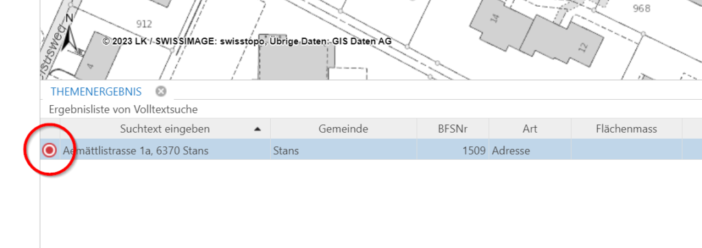 Die Auswertung kann direkt mit einem Klick auf das gewünschte Grundstück gestartet werden. Dazu ist keine vorgängige Suche notwendig und das richtige Werkzeug ist bereits ausgewählt. Trifft man mit dem Mauszeiger mehrere Grundstücke (z.B. Liegenschaft und Baurecht), muss in einem kleinen Fenster das Entsprechende ausgewählt werden (es wird die Parzellennummer angezeigt) (siehe Abb. 1). Die dynamische Auswertung startet dann automatisch.