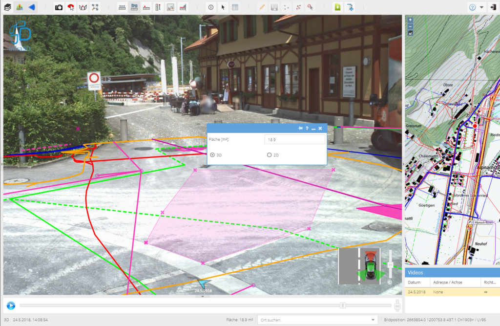 Mit der Anwendung Infra3D werden diese Aufnahmen des Strassenraumes zur Verfügung gestellt, die im Unterschied zu Google Street View gezielt und zu definierten Zeitpunkten erfasst und professionell ausgewertet werden können. Objekte des Strassenraums können so am Computer als Bildmaterial gesichtet, dreidimensional vermessen und mit bestehenden Geodaten verglichen und digitalisiert werden. Das Bildmaterial steht nur in der passwortgeschützten Umgebung zur Verfügung. Personen und Fahrzeugkennzeichen werden zudem in einem automatischen Anonymisierungsprozess unkenntlich gemacht.