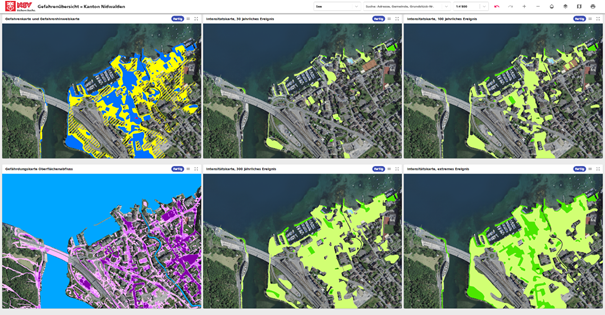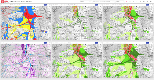 Mit der neuen «Gefahrenübersicht – Kanton Nidwalden» werden nun die verschiedenen Intensitätskarten eines Prozesses auf einem Blick nebeneinander dargestellt. Dadurch wird das Vergleichen der verschiedenen Intensitäten einfacher und Unterschiede zwischen den Intensitätskarten können besser erkannt werden. Neben den vier Intensitätskarten (30-jähriges, 100-jähriges, 300-jähriges und extremes Ereignis) wird auch die vollständige Gefahrenkarte in die Übersicht integriert. Bei den Wasserprozessen wird ergänzend auch die Gefährdungskarte des Oberflächenabflusses integriert.